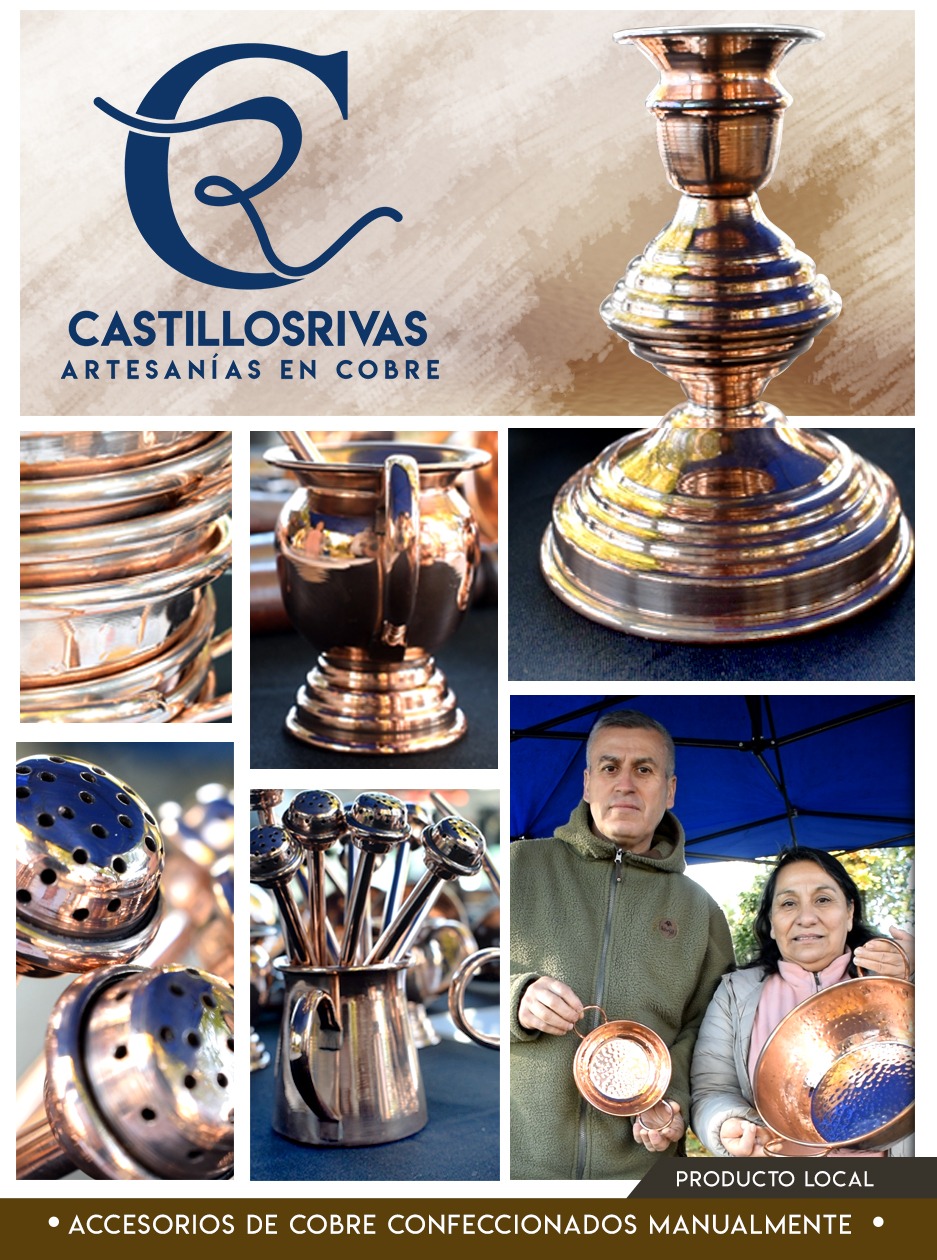 Castillos Rivas, somos una pareja de emprendedores de nuestra comuna que dedica su talento y pasión a la artesanía en cobre. Confeccionamos a mano accesorios únicos, cada pieza forjada con dedicación y el espíritu milenario de este noble oficio. Puedes contactarnos o visitarnos los sábados y domingos en la Plaza de Armas de Yumbel.